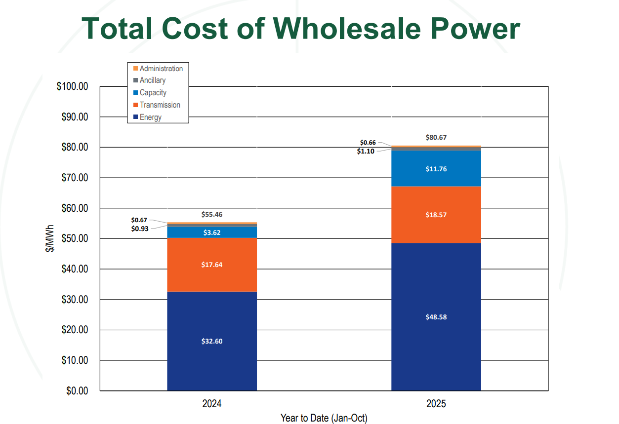 与此同时,该电网的电费也在快速增长中。据独立市场监管机构的统计,今年1至10月PJM电网的整体电力批发价格已经上涨了45%。同时为了确保极端负荷用电的“容量市场拍卖”价格更是翻了数倍,这部分涨价主要由数据中心用电激增带来,但最终会进入数千万美国家庭的电费账单中。