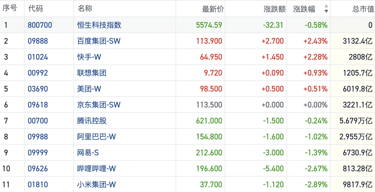 盘面上,今日大型科技股涨跌分化,百度、美团、快手皆有涨幅,小米继续弱势下跌近3%续刷阶段新低,阿里巴巴、腾讯小幅走低。