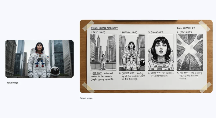 (将一张照片转化为电影分镜,以及翻译饮料包装上的文字,来源:谷歌)