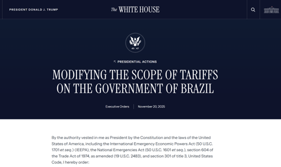 部分商品40%从价关税维持不变,但鉴于谈判取得进展,对美东时间11月13日零点后进入美国的特定巴西农产品取消附加从价关税。