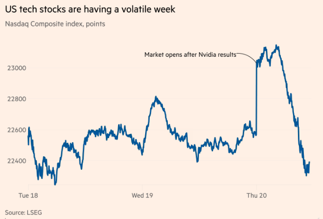 但无论原因如何,美股盘中的暴跌仍抹去了市场早盘对股市将延续反弹的乐观预期——近两周来美股在10月底创下历史新高后已连续遭遇抛售。作为AI热潮核心的芯片制造商英伟达公司最初看似亮眼的财报,以及沃尔玛等零售商显示消费者仍在持续消费的季度业绩更新,都迅速被突然且凶猛的抛售浪潮所淹没。