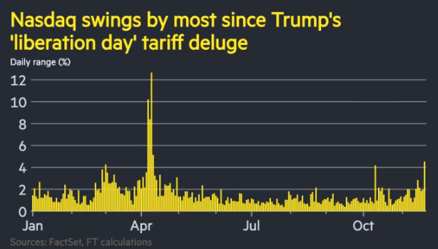 部分交易员指出,市场再度担忧人工智能项目能否产生足够收益或利润来支撑巨额技术投入。另一些人则认为,强劲的9月就业数据延迟公布,是美联储今年已结束降息周期的最新信号。还有人认为,比特币跌至半年低点释放的避险信号部分导致了股市暴跌,市场对估值过高的担忧以及周五期权到期前波动率上升的因素也被提及。