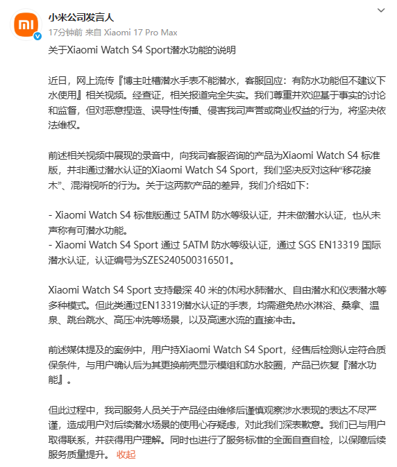 前述媒体提及的案例中,用户持Xiaomi Watch S4 Sport,经售后检测认定符合质保条件,与用户确认后为其更换前壳显示模组和防水胶圈,产品已恢复“潜水功能”。