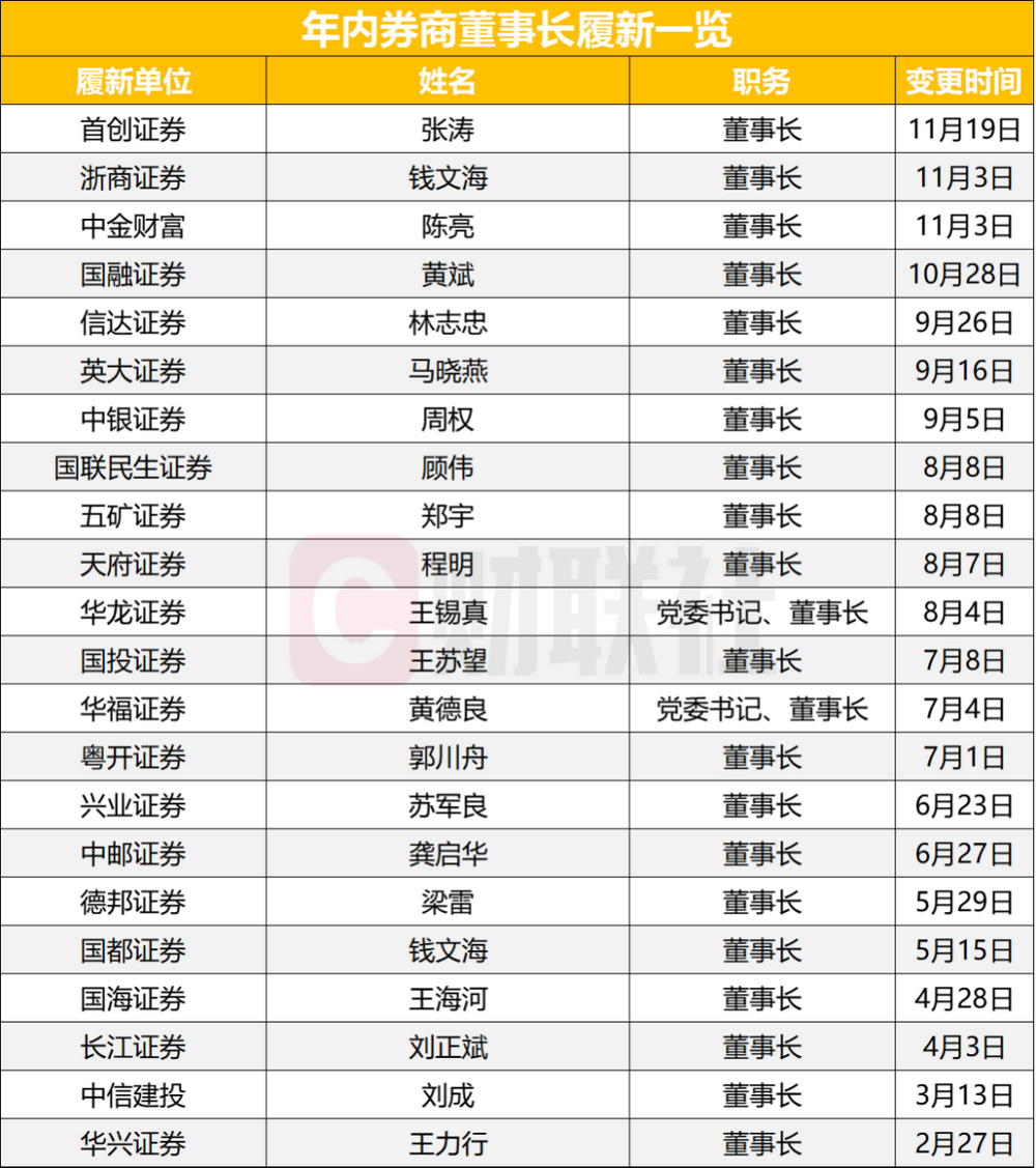 比如,上述中金财富的变动就是一例,11月3日,中金公司党委书记、董事长陈亮正式接过中金财富董事长一职,成为第二任掌舵人。