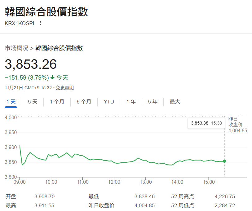 由于周四公布的美国非农数据未能提供有关美联储12月降息前景的明确信息,且亮眼的英伟达财报未能平息AI泡沫担忧。今日,亚太股市全线重挫,韩国股市跌幅尤为剧烈,截至收盘跌近4%。