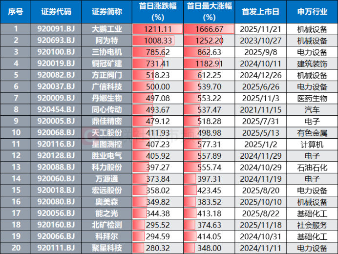 注:首日涨幅居前的北交所股(截至11月21日收盘)