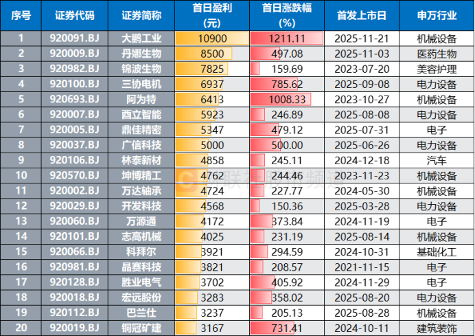 注:首日单签盈利规模居前的北交所股(截至11月21日收盘)