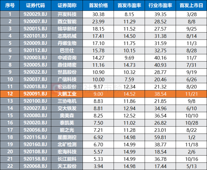 据悉,大鹏工业(N大鹏)为工业精密清洗领域专用智能装备生产商。此次上市,公司发新价格为9元,稍低于年内北交所新股平均发行价(11.65元),发行市盈率14.52倍,大幅低于行业市盈率(38.54倍)。由于发行数据较低且受弱市炒新影响,大鹏工业今日获资金大举“扫货”,收盘涨幅、最大涨幅分别达12.11倍、16.67倍,双双创北交所新纪录。