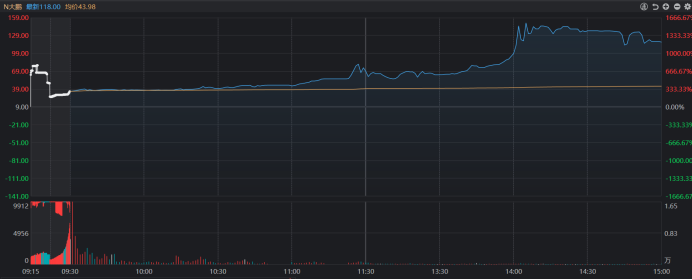 财联社11月21日讯(编辑 梓隆),今日(11月21日),N大鹏(大鹏工业)登陆北交所市场,截至收盘,其全天涨幅1211%,刷新北证新股首日涨幅纪录。以单签100股计算,其首日盈利规模达10900元,同样创北交所新纪录。