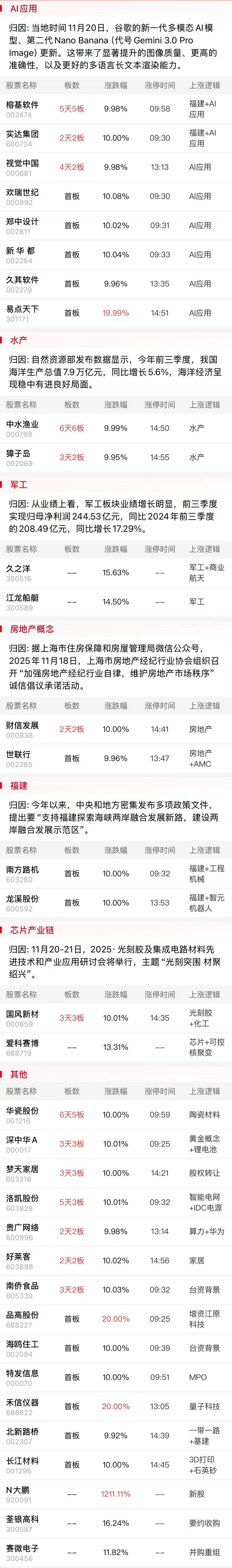 谷歌的新一代多模态AI模型、第二代Nano Banana(Gemini 3.0 Pro Image)昨晚正式更新,实现显著提升的图像质量、更高的准确性,以及更好的多语言长文本渲染能力。AI应用端受此提振卷土重来,叠加福建本地概念的榕基软件晋级5连板,易点天下、视觉中国、久其软件等多股逆势涨停。此次Gemini 3的发布使得谷歌在大模型层面已经与OpenAI、Anthropic处于同一水平,且谷歌的自研芯片和服务器也对英伟达相关产业链形成一定冲击。因此也是近期AI应用以及谷歌链走势远强于英伟达链的主要原因。而AI应用端本身市值体量仍远低于整个算力硬件端,且从腾讯、百度等科技大厂的最新财报看,目前应用端的业绩兑现并未受到算力基础设施的掣肘,或为应用端未来业绩加速释放预期打下伏笔。