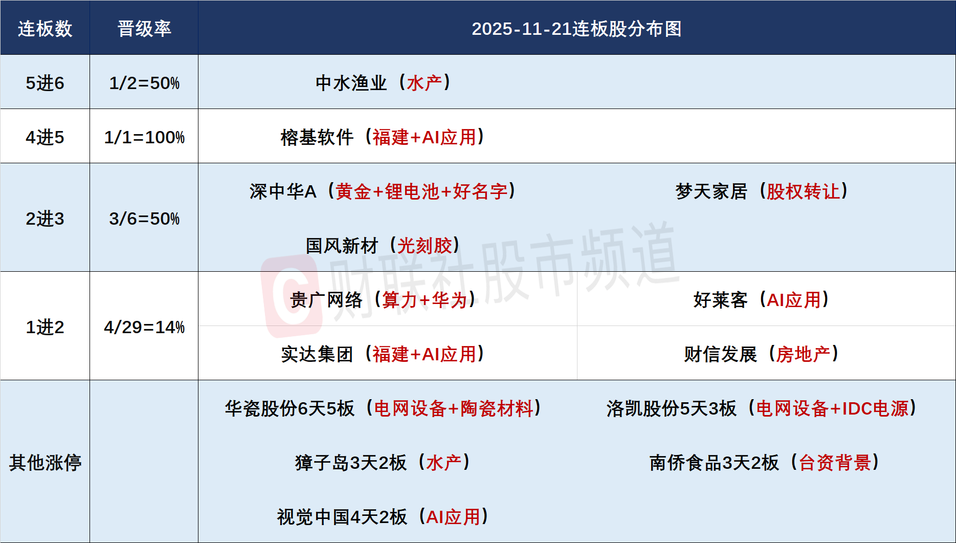 财联社11月21日讯,今日28股涨停,20股炸板,封板率为58%,中水渔业6连板,榕基软件5连板,国风新材、深中华A、梦天家居3连板,华瓷股份6天5板,洛凯股份5天3板。市场全天震荡调整,沪指跌超2%,创业板指跌超4%。沪深两市成交额1.97万亿,较上一个交易日放量2575亿。盘面上个股普跌,全市场近5100只个股下跌。板块方面,中船系、AI应用等板块涨幅居前,电池、硅能源、锂矿等板块跌幅居前。截至收盘,沪指跌2.45%,深成指跌3.41%,创业板指跌4.02%。
