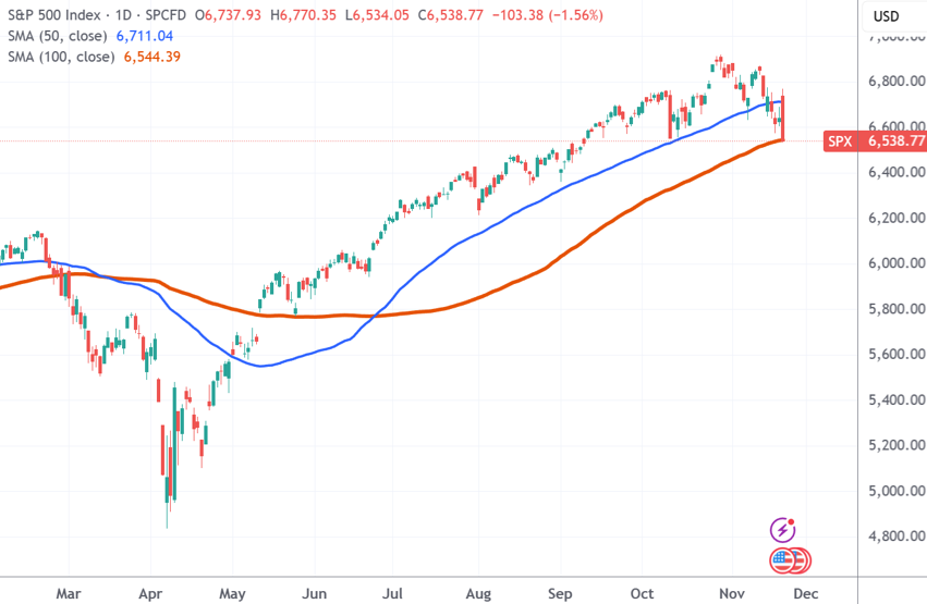 技术面上,昨日标普500指数在日内一度上涨1.9%的情况下,最终收跌1.56%,构成标准的“看跌吞没”形态。美股基准指数在周一跌破50日线后,又在周四跌破100日线。