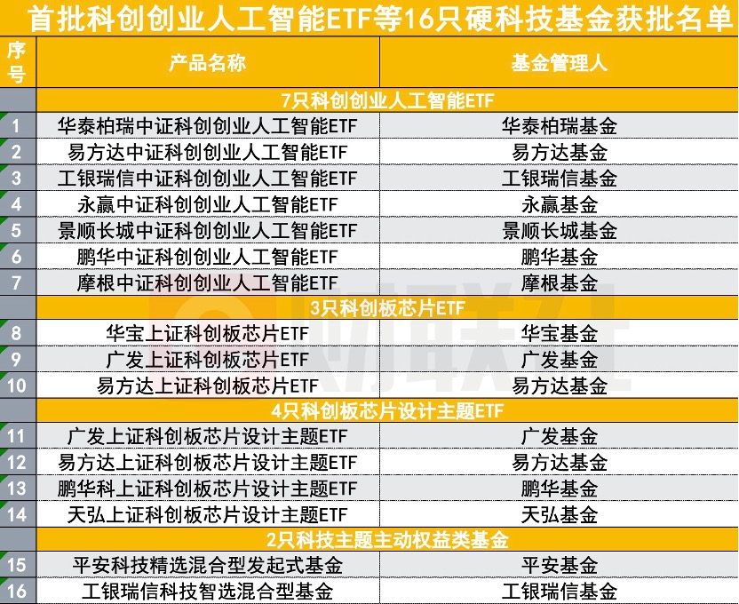 财联社记者获悉,11月21日,有16只硬科技产品同日迅速获批,本次获批的产品阵容包括首批7只科创创业人工智能ETF、3只科创板芯片ETF、4只科创板芯片设计主题ETF,以及2只科技主题主动权益类基金。易方达、华泰柏瑞、工银瑞信、永赢、景顺长城、鹏华、摩根资产管理、华宝、广发、天弘等基金公司拿到入场券。
