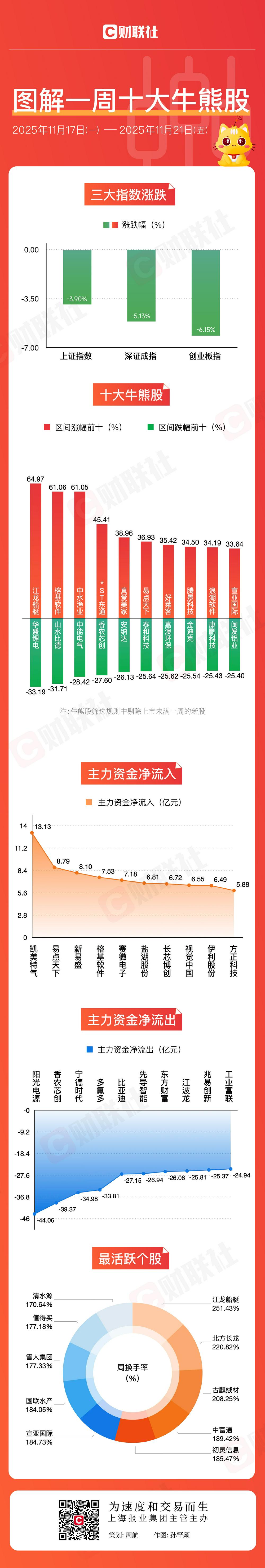财联社11月23日讯,本周A股三大指数震荡下跌,其中上证指数周跌3.90%,深成指周跌5.13%,创业板指周跌6.15%。本周文化传媒板块跌幅较小,中船系、水产养殖概念股表现活跃,电池板块本周回调较为明显。