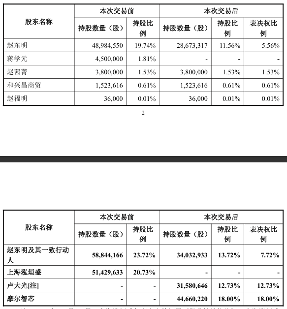 ①禾盛新材控股股东、实际控制人赵东明及其一致行动人向摩尔智芯转让4466.02万股股份。