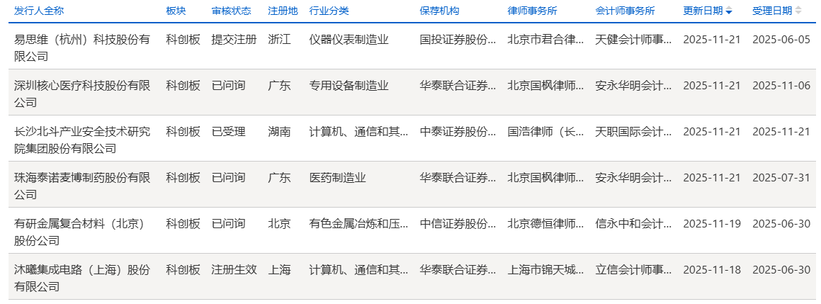 其中,易思维科创板IPO提交注册;北斗院已受理;沐曦股份注册生效;泰诺麦博、有研复材、核心医疗3家企业审核状态为已问询。