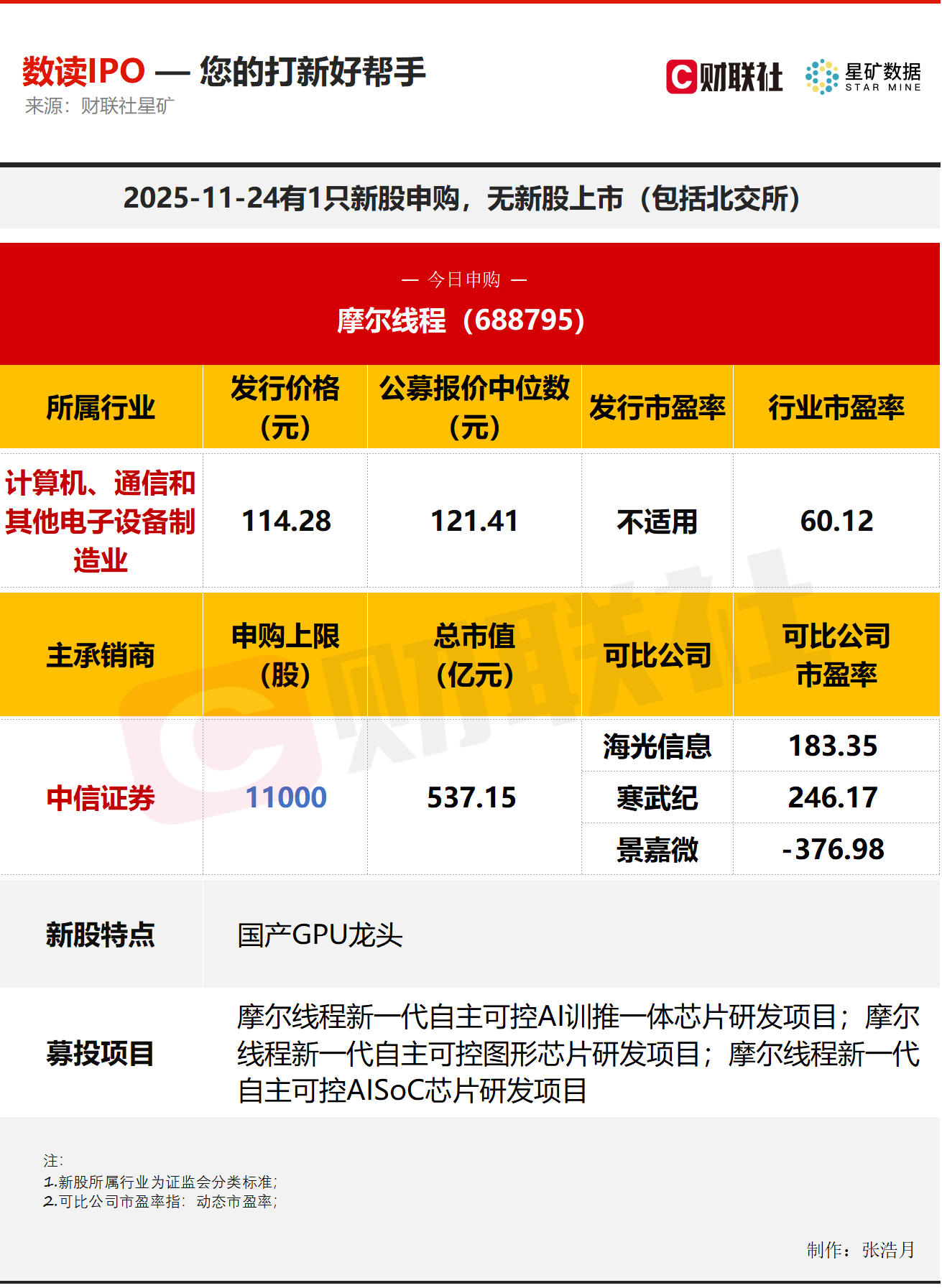 财联社11月24日讯,今日有1只新股申购,为科创板的摩尔线程;无新股上市。