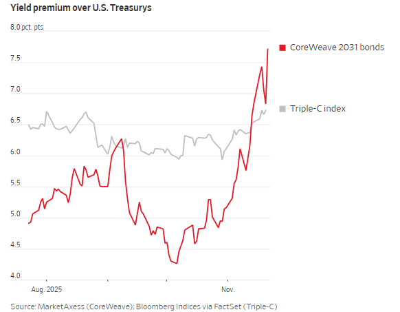 与此同时,其他规模更小的AI公司则更是不得不面临投资者所要求的更高收益率溢价。以CoreWeave为例,这是目前唯一一家发行非投资级债券的大型AI云服务提供商。