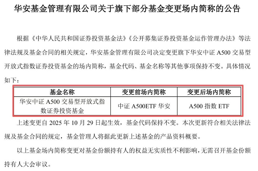 今年7月1日,规模排名第一的华泰柏瑞A500ETF场内简称由“中证A500ETF基金”为“A500ETF华泰柏瑞”。