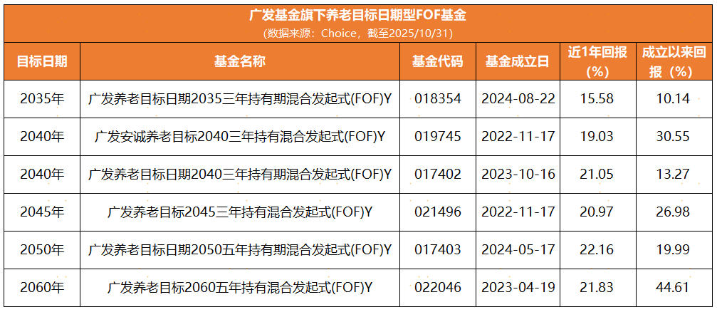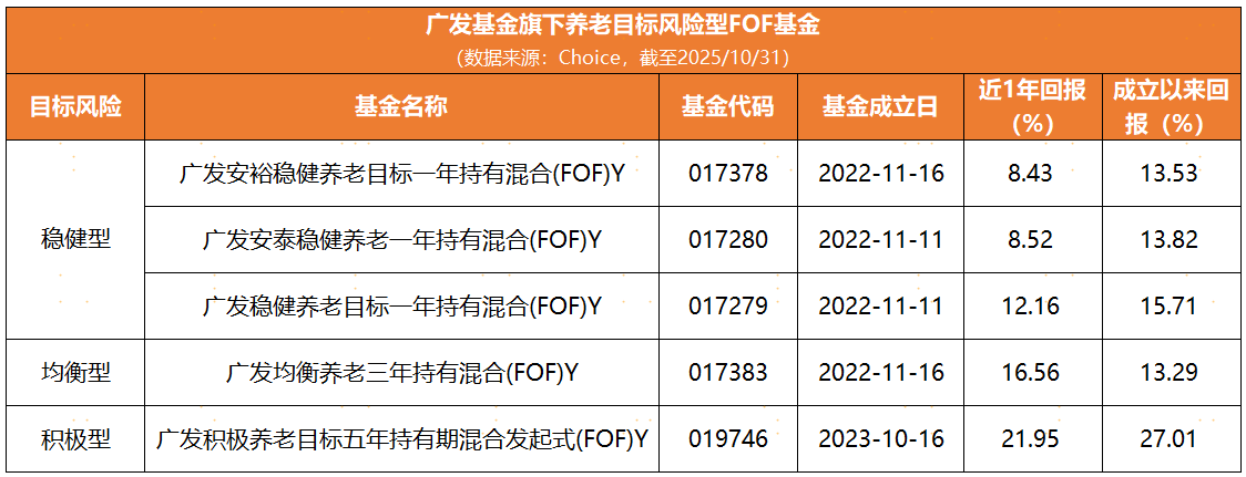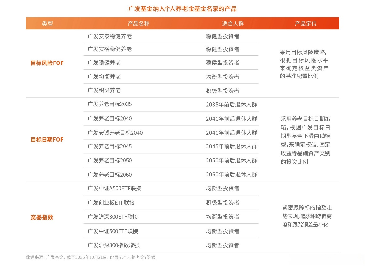 截至10月末,广发基金旗下共有16只Y份额基金,包括6只目标日期型FOF、5只目标风险型FOF及5只指数型基金,养老产品线较为完善。其中,目标风险型产品覆盖稳健、均衡、积极,目标日期型产品覆盖2035—2060年的主要退休年龄段人群;指数型产品跟踪的标的指数分别为中证A500、中证500、创业板和沪深300,覆盖A股市场核心蓝筹股及成长龙头,且产品之间的成长价值风格能实现较好互补。