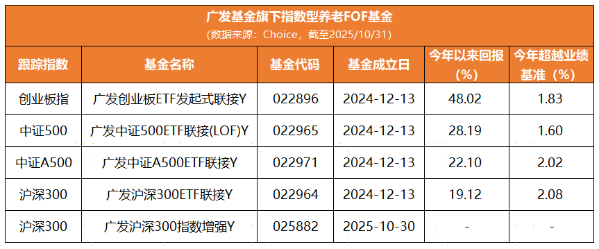 指数投资方面,广发基金自2008年开始布局指数业务,现已打造“多区域、多策略、多资产”的完备指数产品线,并针对个人养老金账户设立5只跟踪主流宽基指数的Y份额产品,覆盖A股市场核心蓝筹股及成长龙头。截至2025年10月31日,广发旗下4只指数产品(不含年内成立的产品)成立以来的年化跟踪误差均低于1%,对标的指数实现了较好的跟踪效果。