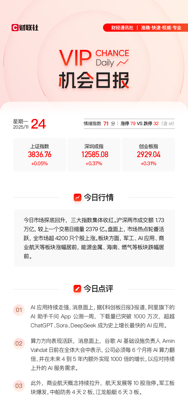 11月23日18:08《财联社早知道》追踪到谷歌称公司算力必须每半年翻一倍,指出机构表示模型升级催生算力需求,并提及上市公司中富电路和光库科技,其在11月24日双双涨超10%。