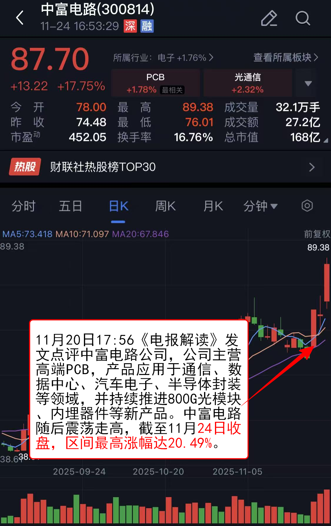 11月20日17:56《电报解读》发文点评中富电路公司,公司主营高端PCB,产品应用于通信、数据中心、汽车电子、半导体封装等领域,并持续推进800G光模块、内埋器件等新产品。中富电路随后震荡走高,截至11月24日收盘,区间最高涨幅达20.49%。