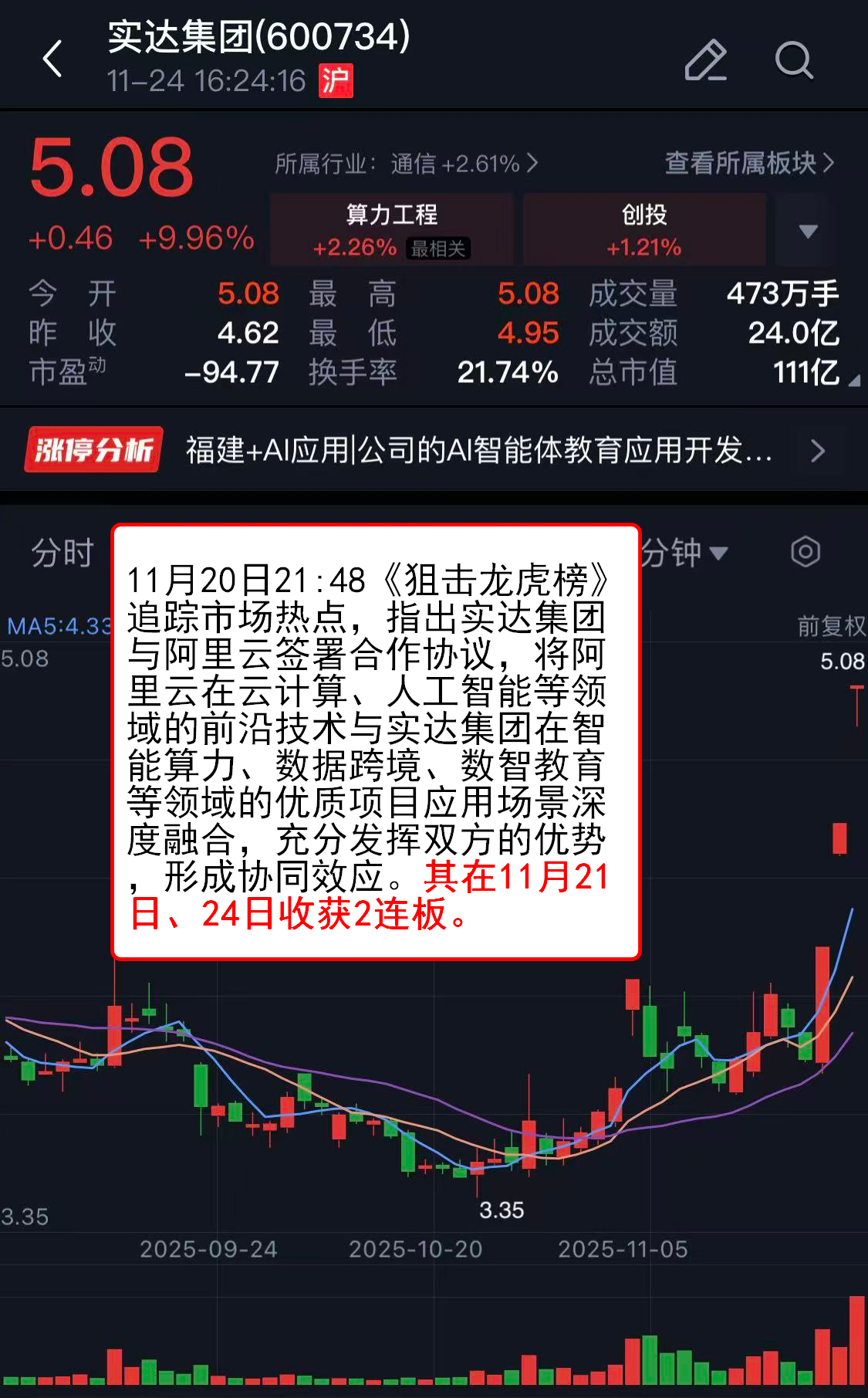 11月20日21:48《狙击龙虎榜》追踪市场热点,指出实达集团与阿里云签署合作协议,将阿里云在云计算、人工智能等领域的前沿技术与实达集团在智能算力、数据跨境、数智教育等领域的优质项目应用场景深度融合,充分发挥双方的优势,形成协同效应。其在11月21日、24日收获2连板。