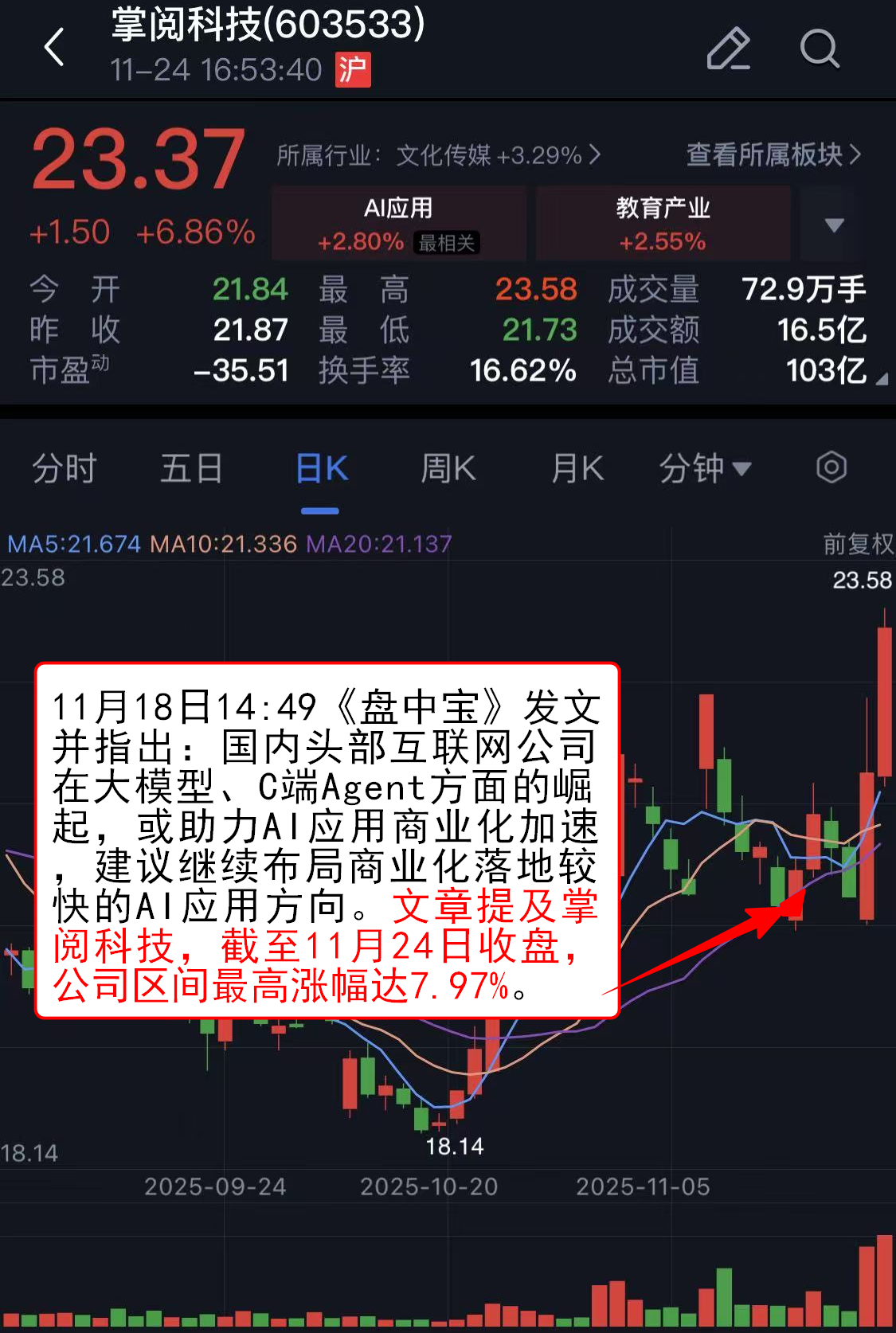 11月18日14:49《盘中宝》发文并指出:国内头部互联网公司在大模型、C端Agent方面的崛起,或助力AI应用商业化加速,建议继续布局商业化落地较快的AI应用方向。文章提及掌阅科技,截至11月24日收盘,公司区间最高涨幅达7.97%。