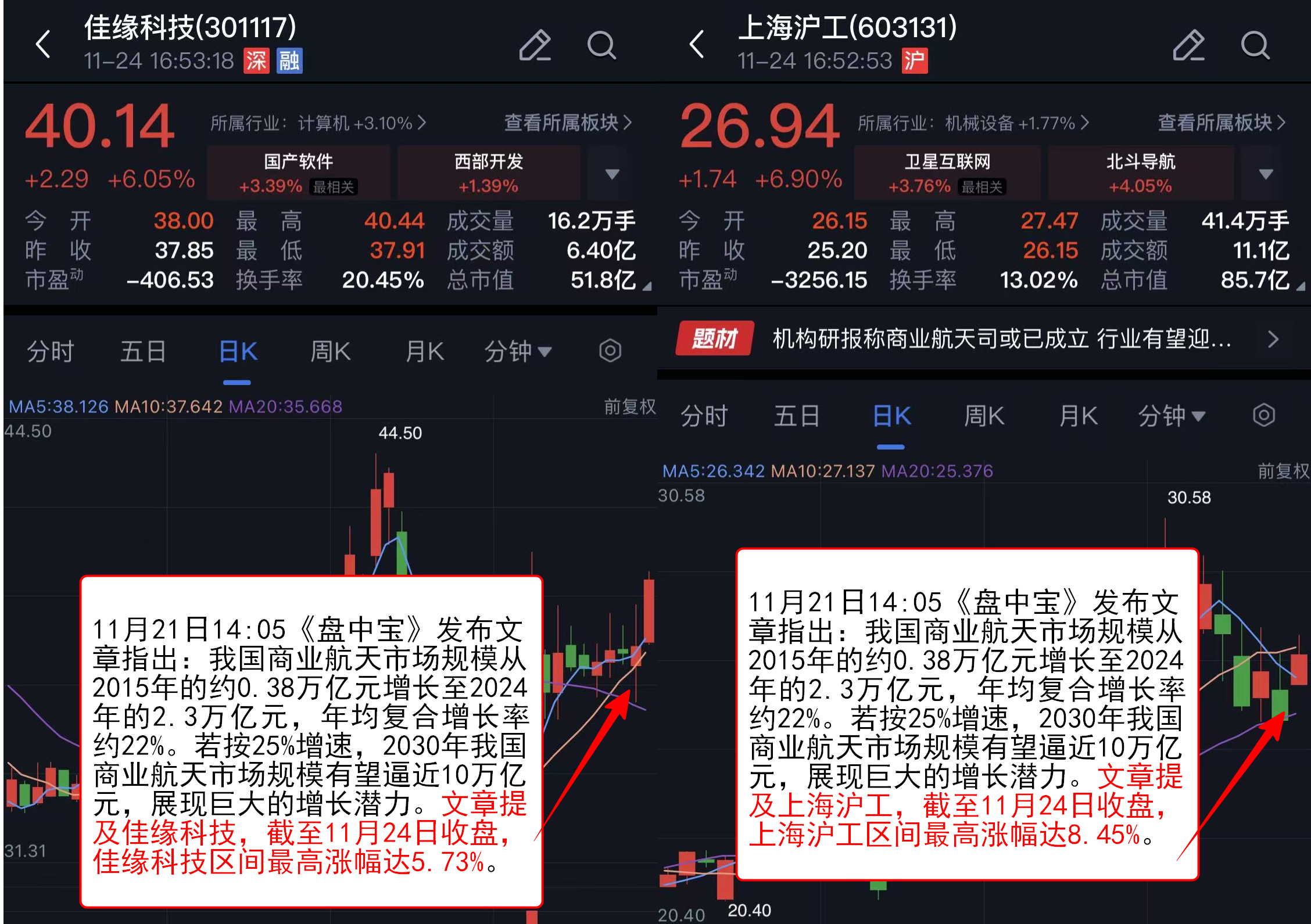 11月21日14:05《盘中宝》发布文章指出:我国商业航天市场规模从2015年的约0.38万亿元增长至2024年的2.3万亿元,年均复合增长率约22%。若按25%增速,2030年我国商业航天市场规模有望逼近10万亿元,展现巨大的增长潜力。文章提及佳缘科技和上海沪工,截至11月24日收盘,佳缘科技区间最高涨幅达5.73%,上海沪工区间最高涨幅达8.45%。