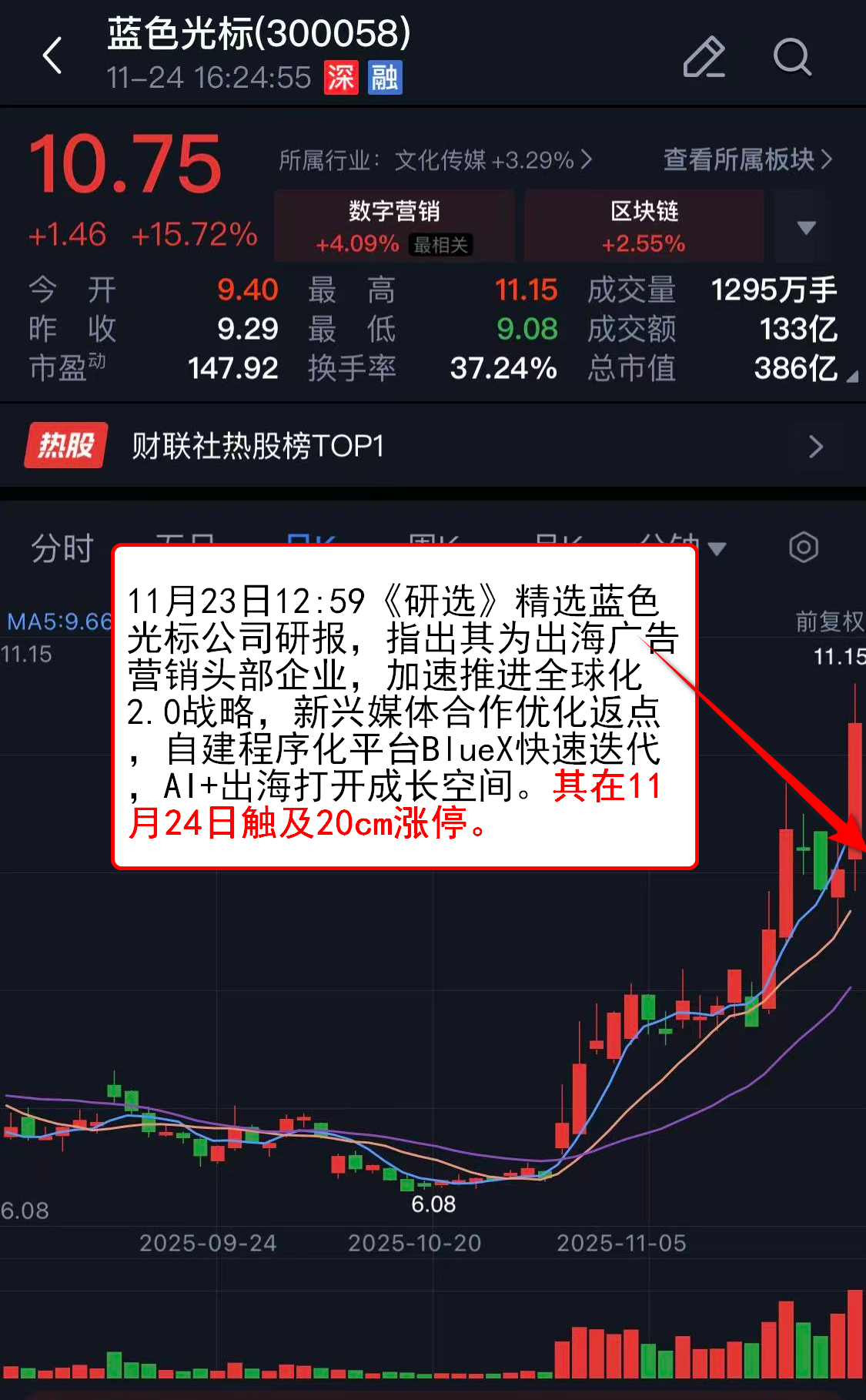 11月23日12:59《研选》精选蓝色光标公司研报,指出其为出海广告营销头部企业,加速推进全球化2.0战略,新兴媒体合作优化返点,自建程序化平台BlueX快速迭代,AI+出海打开成长空间。其在11月24日触及20cm涨停。
