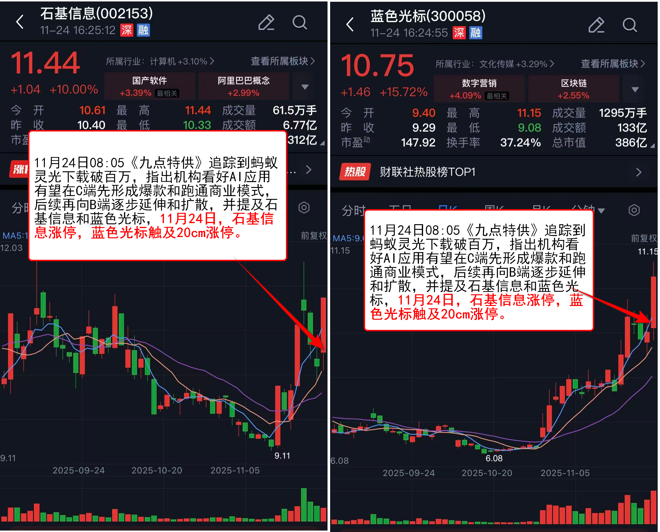 11月24日08:05《九点特供》追踪到蚂蚁灵光下载破百万,指出机构看好AI应用有望在C端先形成爆款和跑通商业模式,后续再向B端逐步延伸和扩散,并提及石基信息和蓝色光标,11月24日,石基信息涨停,蓝色光标触及20cm涨停。