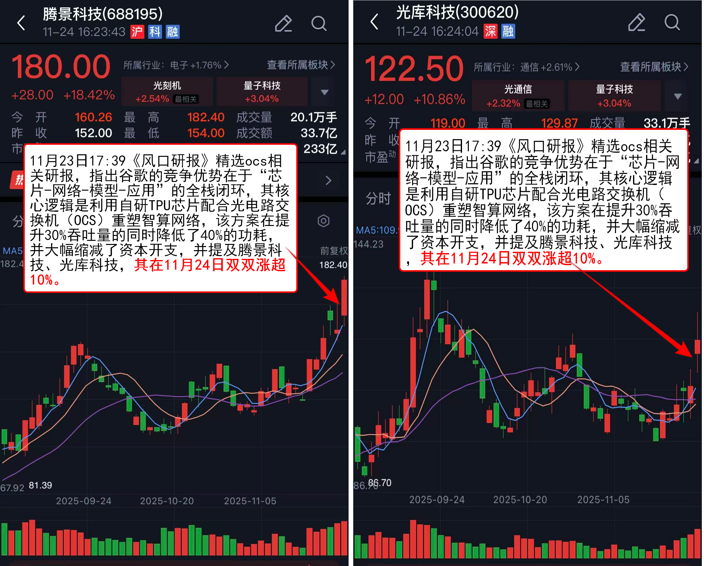 11月23日17:39《风口研报》精选ocs相关研报,指出谷歌的竞争优势在于“芯片-网络-模型-应用”的全栈闭环,其核心逻辑是利用自研TPU芯片配合光电路交换机(OCS)重塑智算网络,该方案在提升30%吞吐量的同时降低了40%的功耗,并大幅缩减了资本开支,并提及腾景科技、光库科技,其在11月24日双双涨超10%。