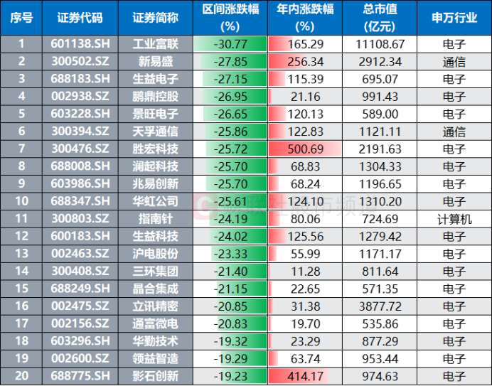 近段时间以来,以TMT板块为代表的科技赛道持续回调,以申万一级板块统计,截至今日收盘,电子、通信、计算机、传媒板块指数自10月30日以来近1个月分别下跌15.14%、12.66%、8.20%、1.98%。具体个股来看,除工业富联外,新易盛、生益电子、鹏鼎控股、景旺电子、天孚通信、胜宏科技、澜起科技、兆易创新、华虹公司等股近期也跌幅明显。
