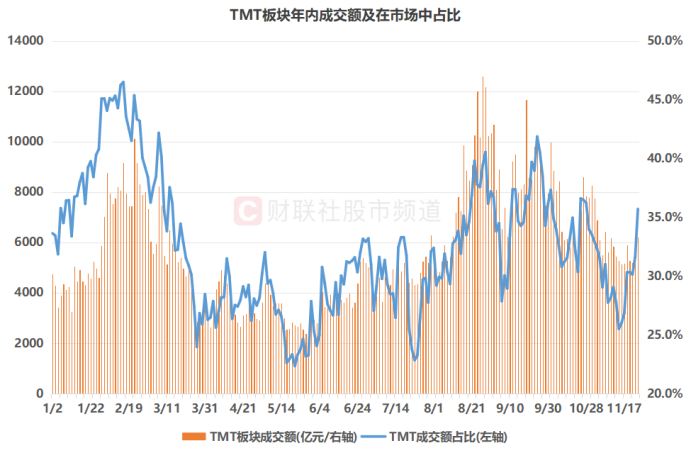 注:TMT板块年内成交额及在市场中占比(截至11月24日收盘)