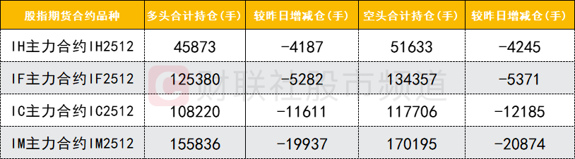 四大期指主力合约中,IH、IF、IC、IM合约多空双方均减仓,IM空头减仓数量较多。