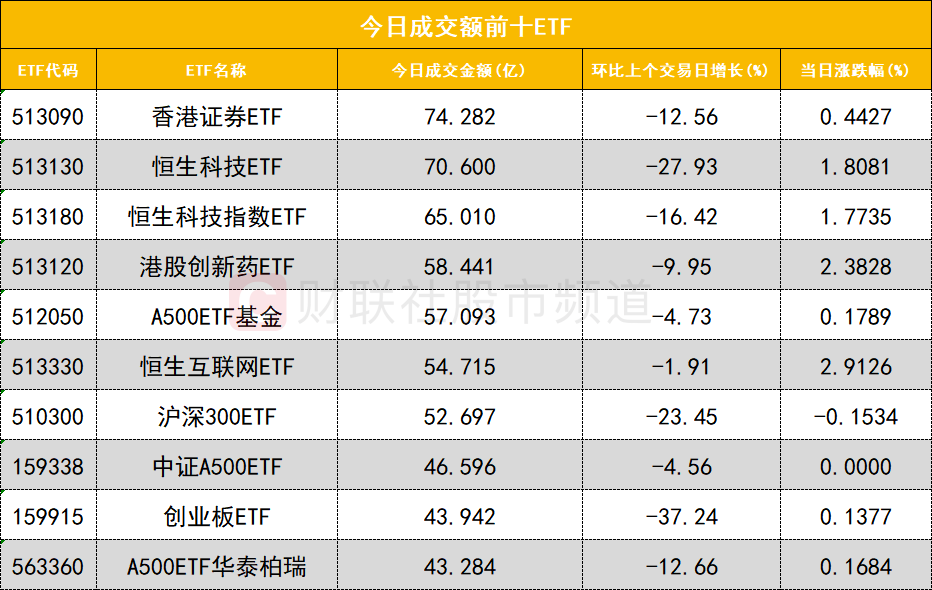 从成交额前十的ETF来看,香港证券ETF(513090)成交额位居首位,恒生科技ETF(513130)成交额位居次席。