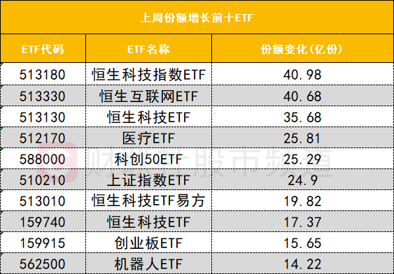在上周份额增长前十ETF中,恒生科技指数ETF(513180)上周份额增长40.98亿份位居首位;恒生互联网ETF(513330)上周份额增长40.68亿份位居次席。