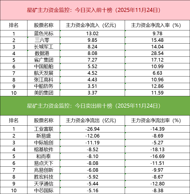 从个股主力资金监控数据来看,主力资金净流入前十的个股所属板块以AI应用和军工方向为主,蓝色光标净流入居首。