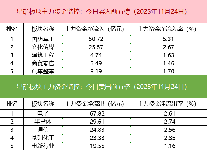 从主力板块资金监控数据来看,国防军工板块主力资金净流入居首。