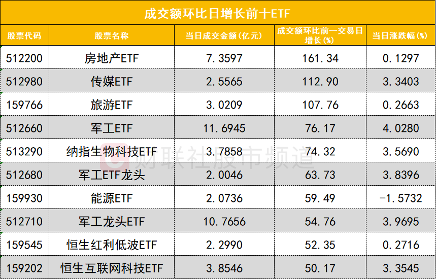 从成交额环比增长前十的ETF来看,房地产ETF(512200)成交额环比增长161%位居首位;传媒ETF(512980)成交额环比增长112%位居次席。