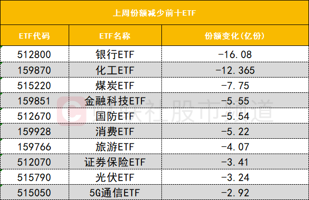 在上周份额减少前十的ETF中,银行ETF(512800)份额大减16.08亿份。上周银行板块未延续强势,板块周线下跌1.74%。农业银行创新高后震荡回落,上周跌5.29%。