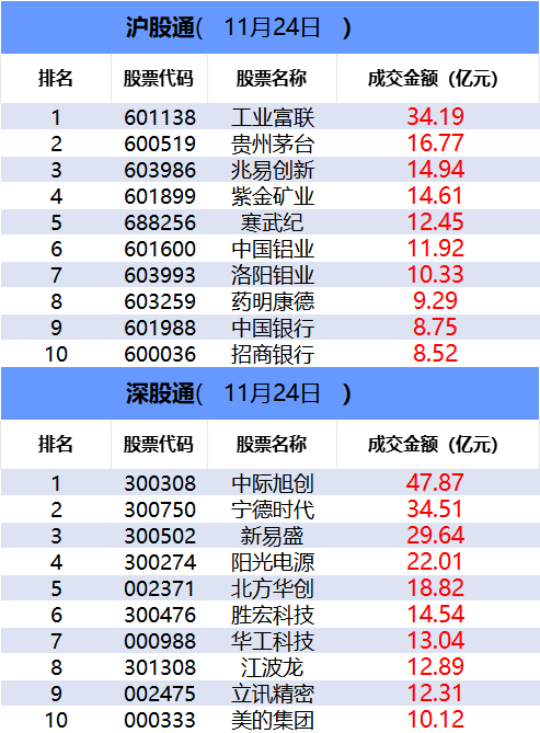 从沪股通前十大成交个股来看,工业富联位居首位;贵州茅台和兆易创新分居二、三位。
