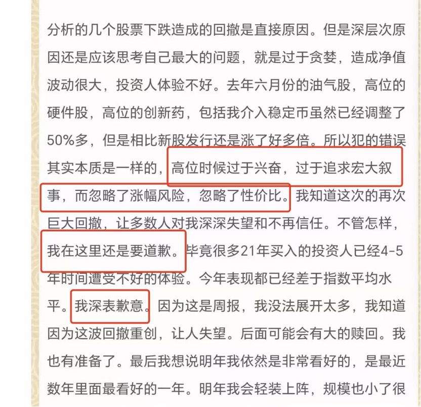 在周报的最后,梁宏再次诚恳道歉,“我知道因为这波回撤重创,让人失望。”梁宏表示,毕竟很多2021年买入的投资人已经4-5年时间遭受不好的体验。今年表现都已经差于指数平均水平,深表歉意。