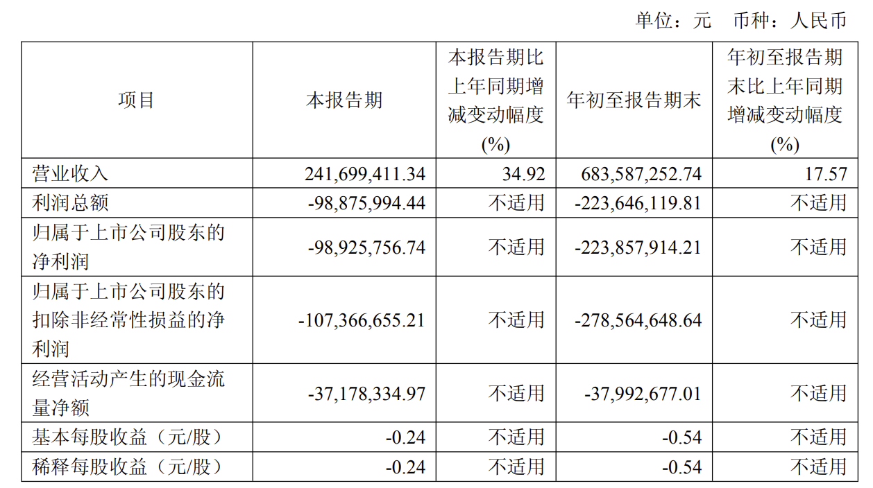日前,百奥泰发布的2025年三季报显示,其当季度实现营业收入2.42亿元,同比增长34.92%;扣非净利润为-1.07亿元,同比收窄19.93%。从前三个季度的总体表现来看,其累计实现营收6.84亿元,同比增长17.57%,归母净利润为-2.24亿元,同比增长38.72%;扣非归母净利润为-2.79亿元,同比增长31.12%。