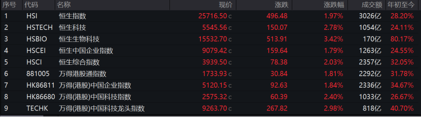 截至今日收盘,恒生指数收涨1.97%,报25716.5点,止步六连跌行情;恒生科技指数同样如此,今日收涨2.78%。传媒、国防军工、医药生物等港股细分板块成为领涨主力,恒生生物科技收涨3.42%。