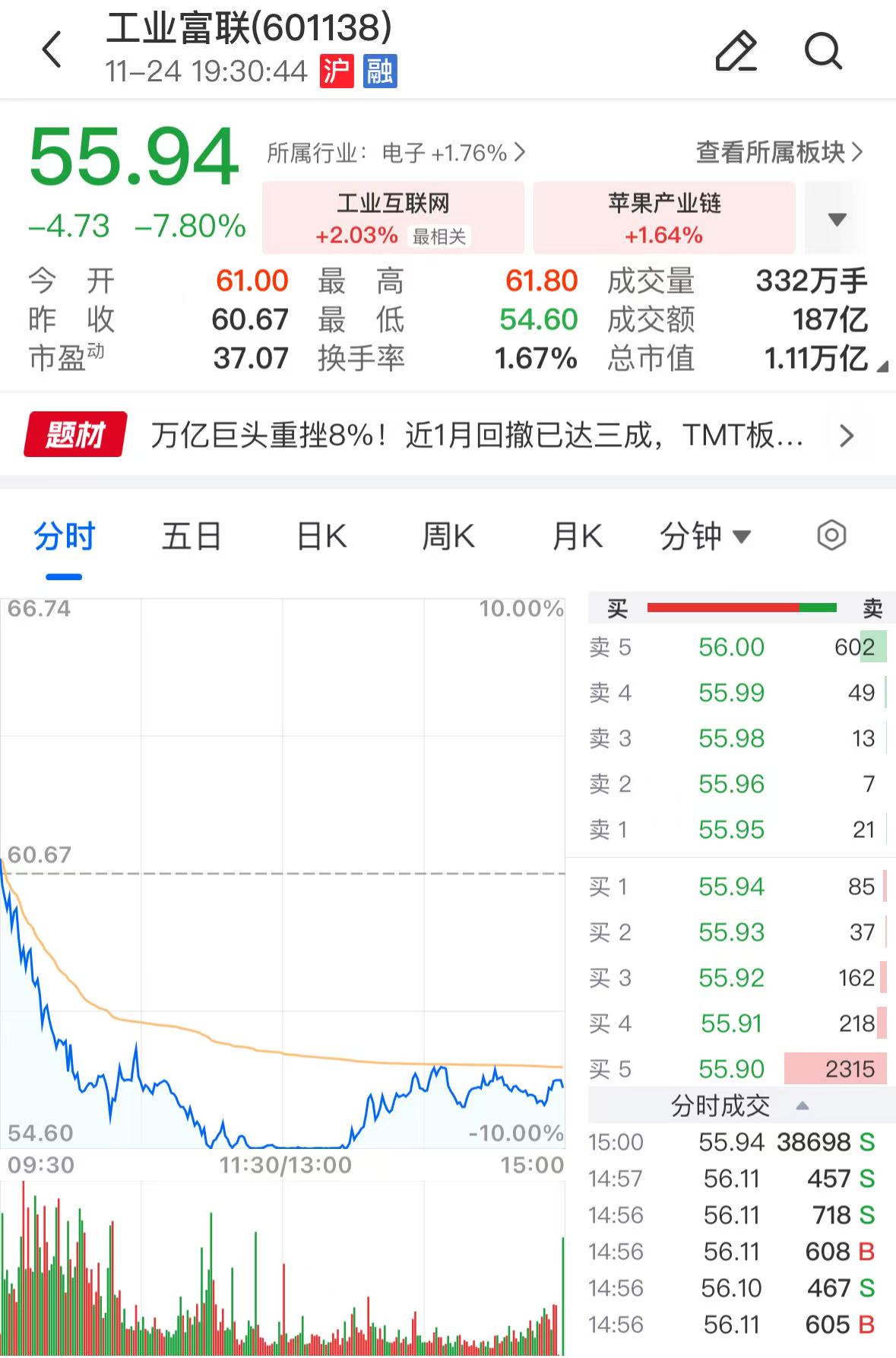 受市场传言的影响,工业富联今日股价出现大幅下跌,盘中触及跌停。截至收盘,该股股价报收55.94元/股,单日下跌7.8%,目前总市值为11109亿元。