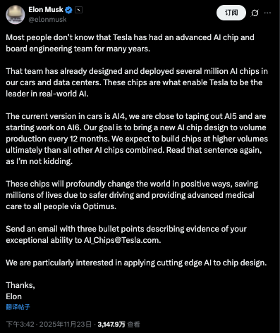作为最新动向的背景,马斯克上周末在社交平台X发文称,大多数人并不知道,特斯拉多年来一直拥有一支“先进的AI芯片与主板工程团队”,这支团队已经为汽车与数据中心设计并部署了数百万颗AI芯片,使特斯拉成为“真实世界AI”的领导者。