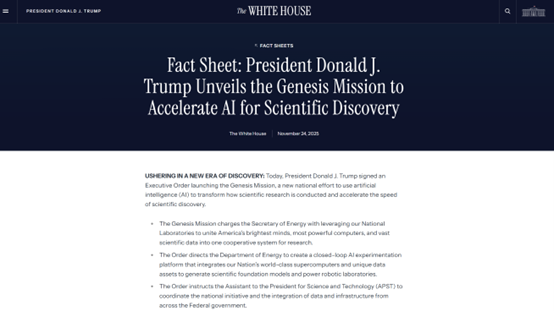 财联社11月25日讯(编辑 卞纯)综合央视新闻等媒体报道,当地时间11月24日,美国白宫发布声明表示,总统特朗普签署了一项行政命令,启动一项旨在利用人工智能(AI)变革科学研究方式、加速科学发现的全新国家计划“创世纪计划”(Genesis Mission)。