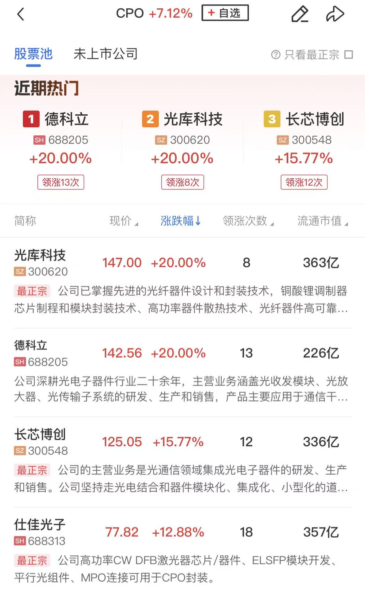 板块上,光通信概念全新爆发,谷歌链方向领涨,光库科技、德科立、长光华芯20cm涨停,腾景科技、长芯博创、仕佳光子、炬光科技、太辰光均涨超10%。